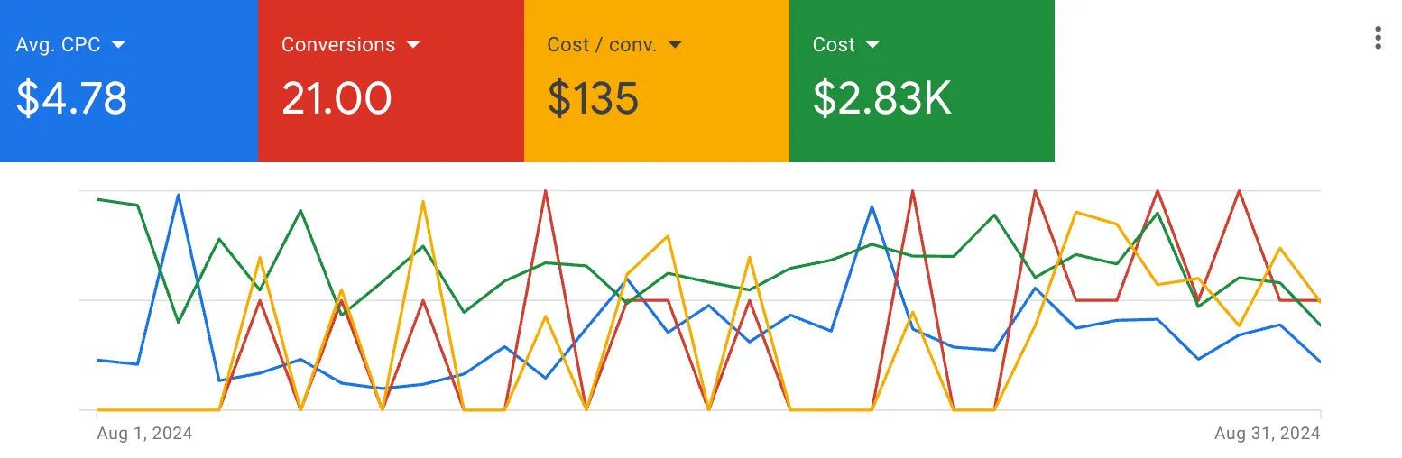 By August, the combination of the Demand Gen campaign, automated scripts, real person optimization, and increased investment, this client continued to see even greater success at lower cost-per-click and lead. We increased their conversions by 425% while decreasing both cost-per-lead by 64% and cost-per-click by 87%.