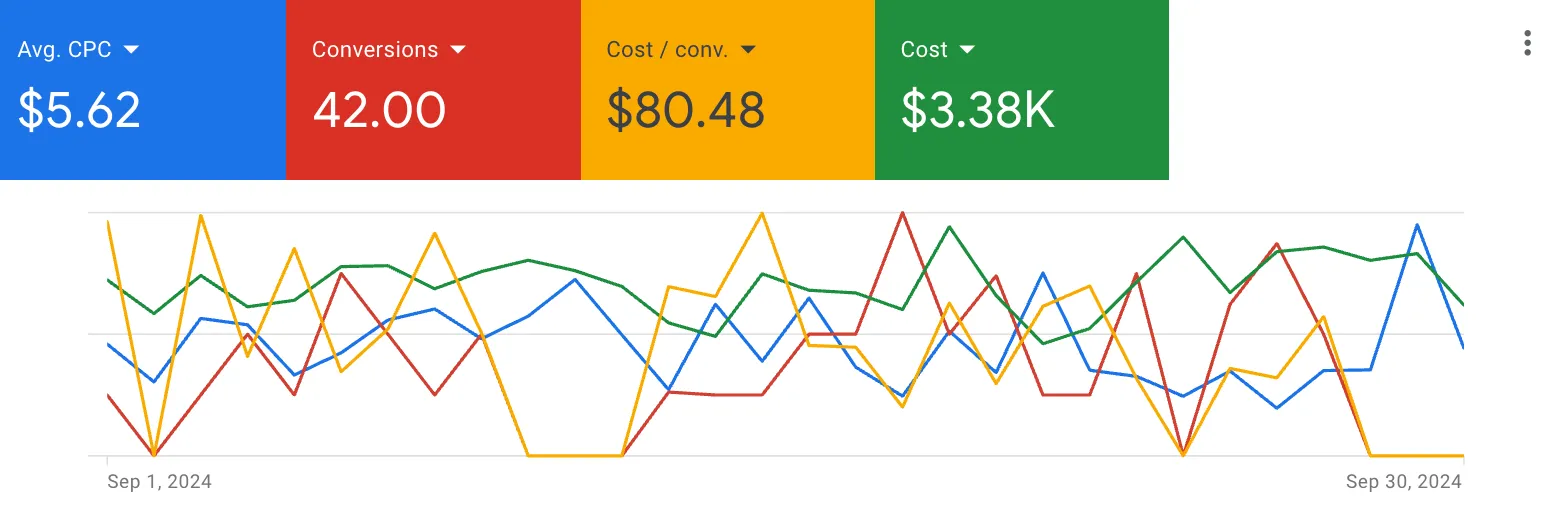 Overall, from February to September, cost-per-click decreased by 72%, leads increased by 4100%, and cost-per-lead decreased by 92%.